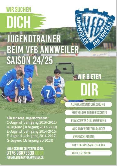 Der VfB Annweiler sucht noch Personen, denen der Jugendfußball am Herzen liegt und sich in der Jugendabteilung als Trainer einbringen möchten. Gerne könnt ihr hierzu unseren Jugendleiter Sebastian Rödel kontaktieren.