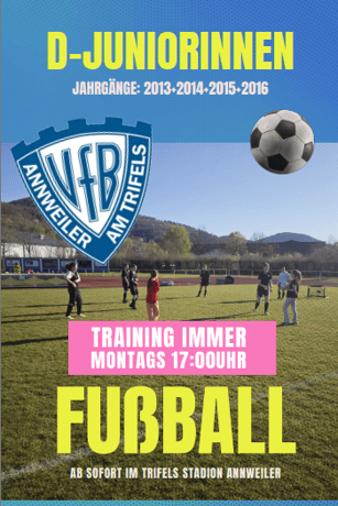 Der VfB Annweiler baut eine neue D-Juniorinnen Mannschaft auf. Interssierte können jederzeit teilnehmen. Schnuppertraining ist immer möglich. Bitte teilt diese Information gerne weiter.